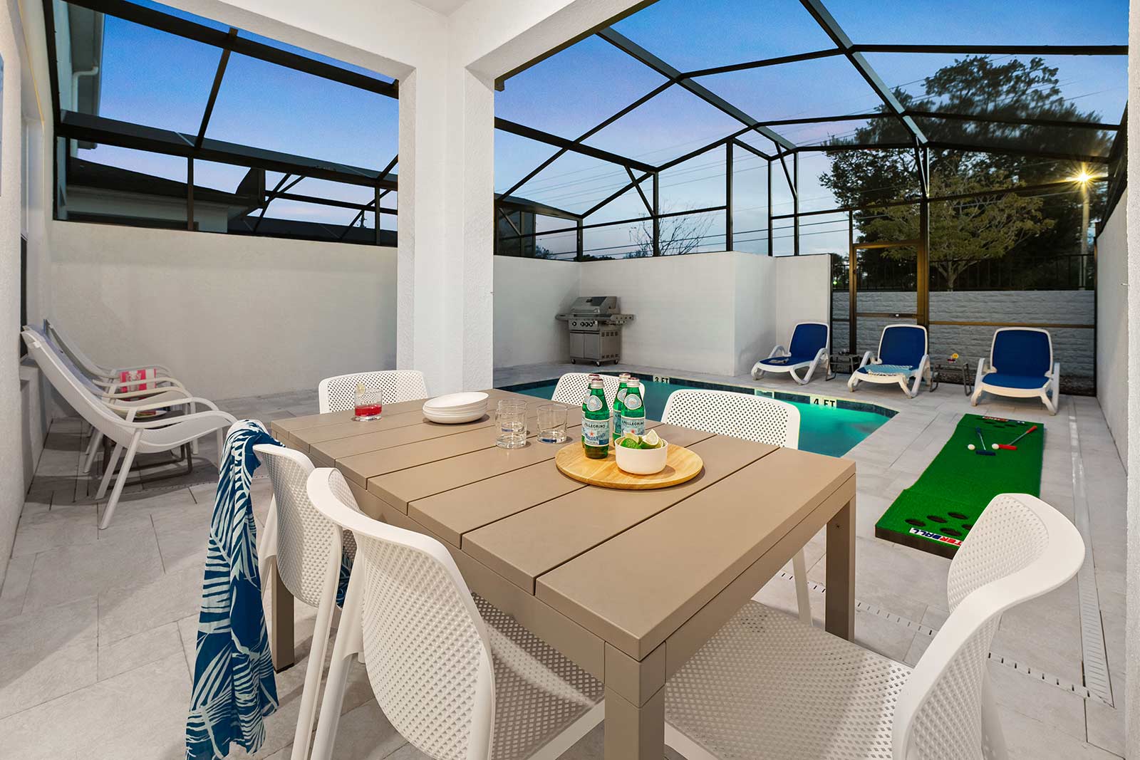 Pool & Patio: Pool days are an integral part of any Orlando vacay–and this villa features its very own! Start or end your day with a splash, without even leaving the front door. Whether you’re taking a dip in the refreshing water, sunbathing on a comfy lounger, or dining al fresco at the patio table, this outdoor oasis is a dream spot for R&R.