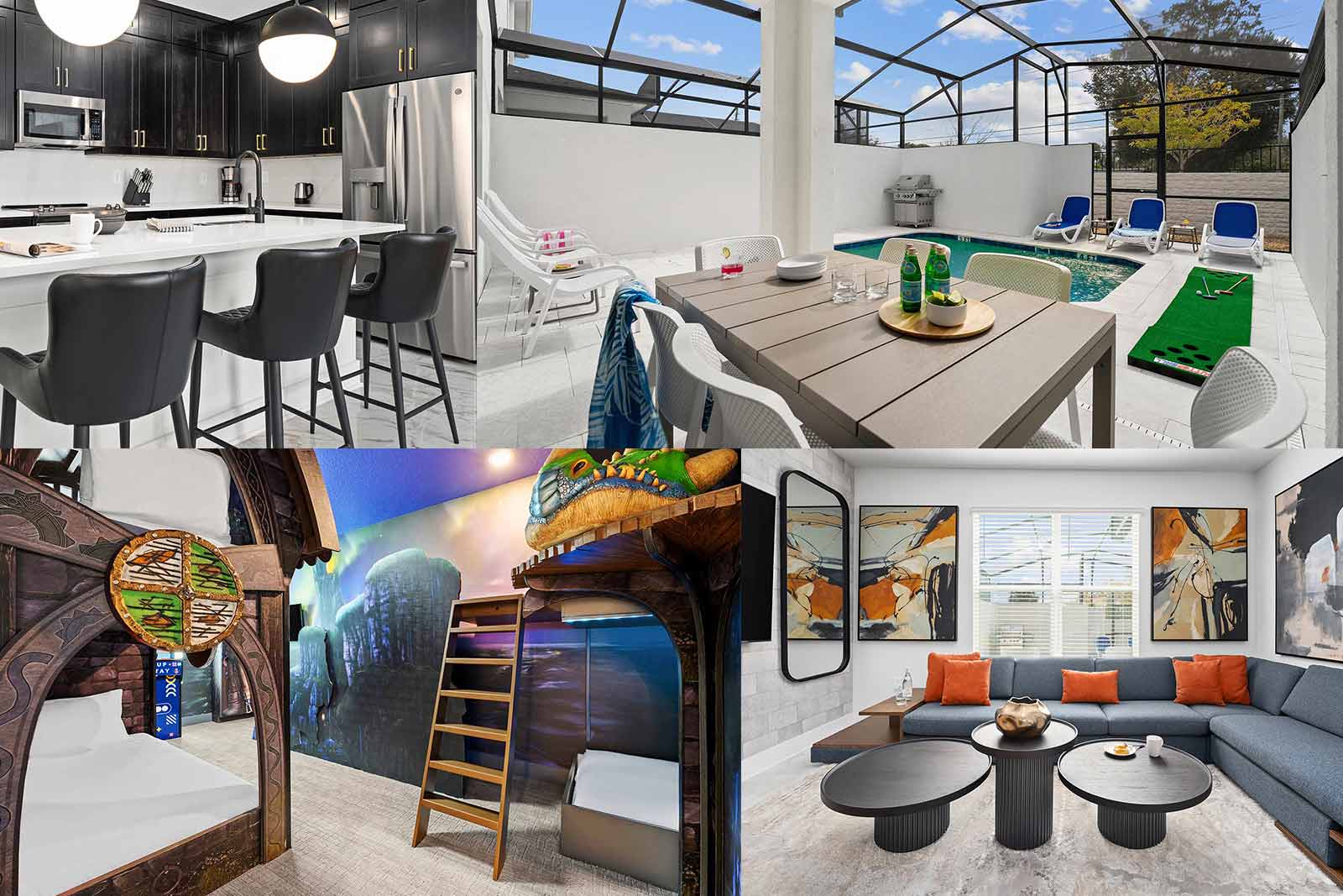 Urban sophistication meets cozy vibes in this super chic 4-bedroom gem on Orlando's International Drive–steps from the best theme parks, attractions, dining, and shopping this epic city has to offer. Set your bags down in one of three delicious king bedrooms, and send the littles off to enjoy the whimsical themed bedroom—where their imaginations will run as wild as the Universal Orlando coasters down the road. Start or end your day at your private pool ft. loungers, a patio table, and more.