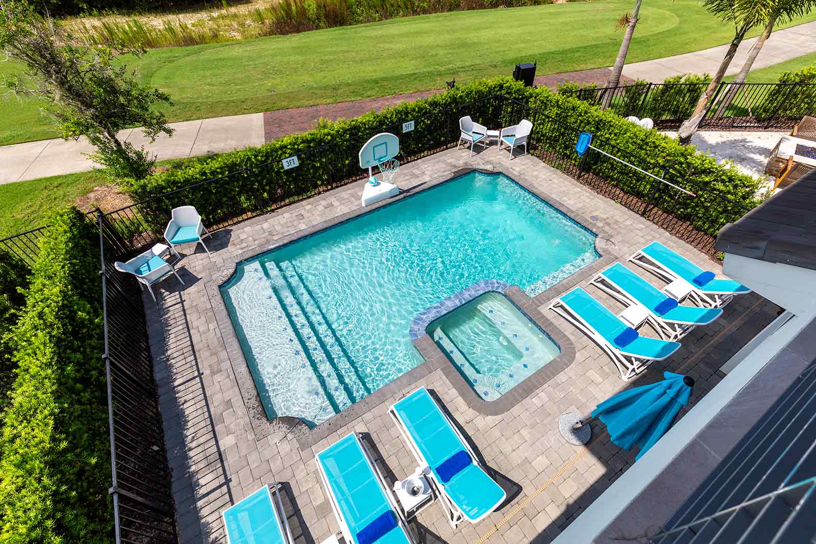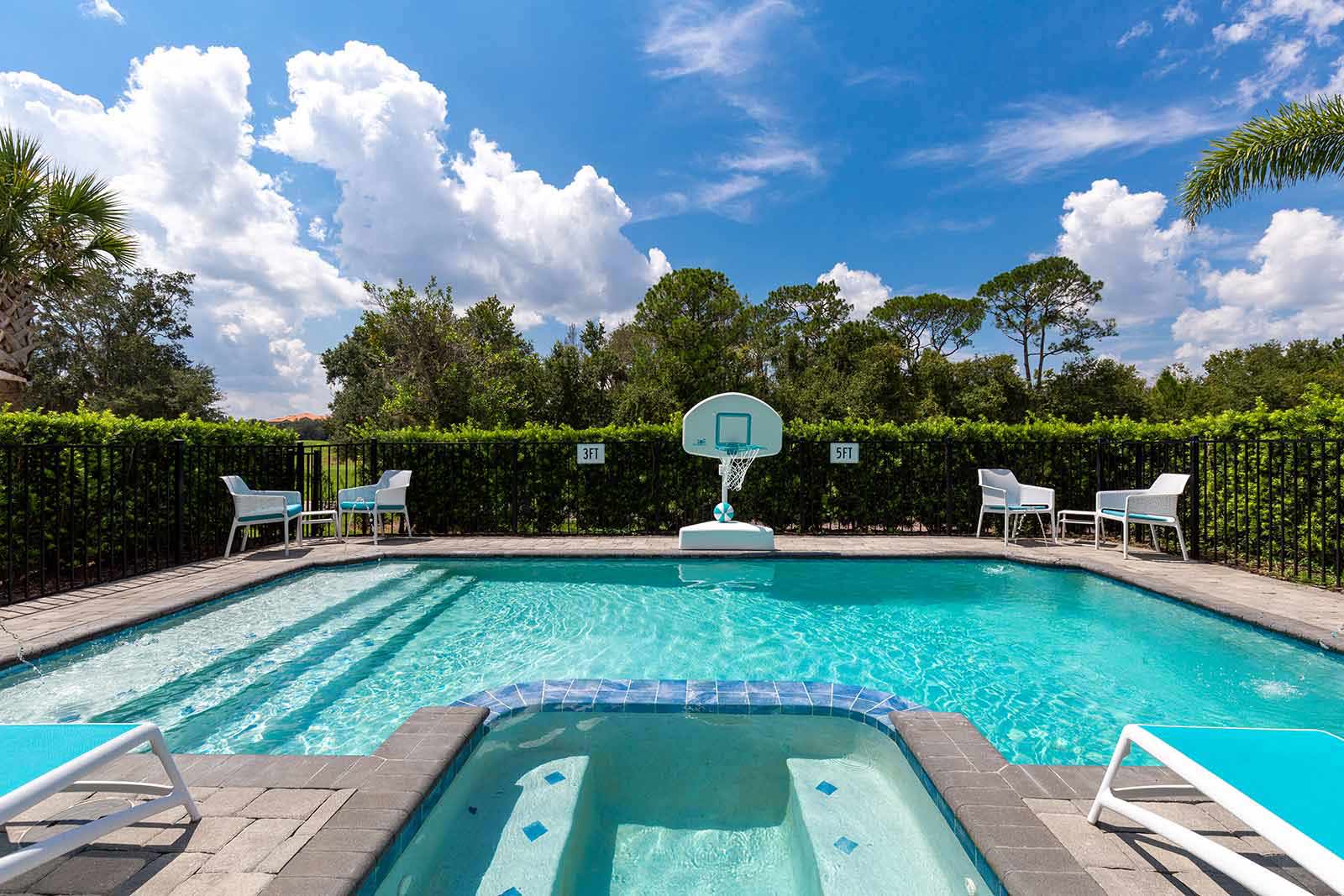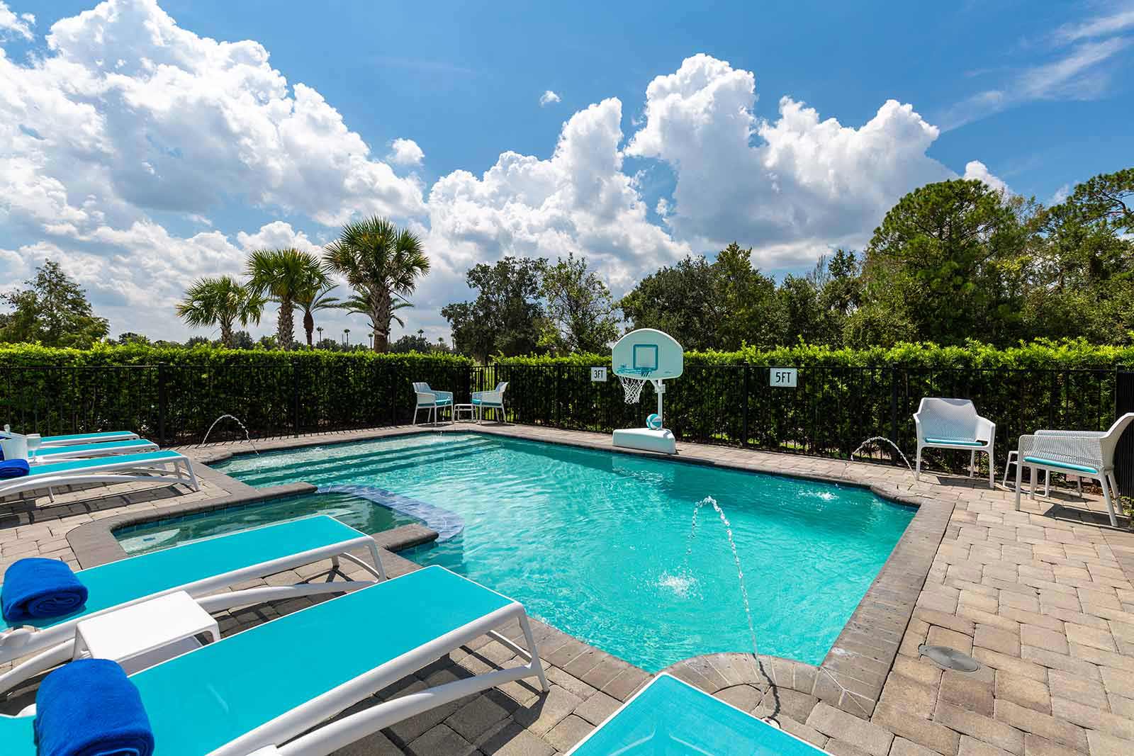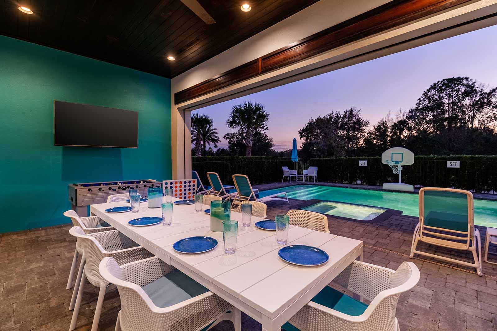 The good times continue outside on the patio, where you can compete in a game of foosball, or catch the game on the outdoor flat-screen, before taking a splash in your own private pool and spillover spa. Giant connect four and in-pool basketball are also available to keep you entertained throughout your swim!
