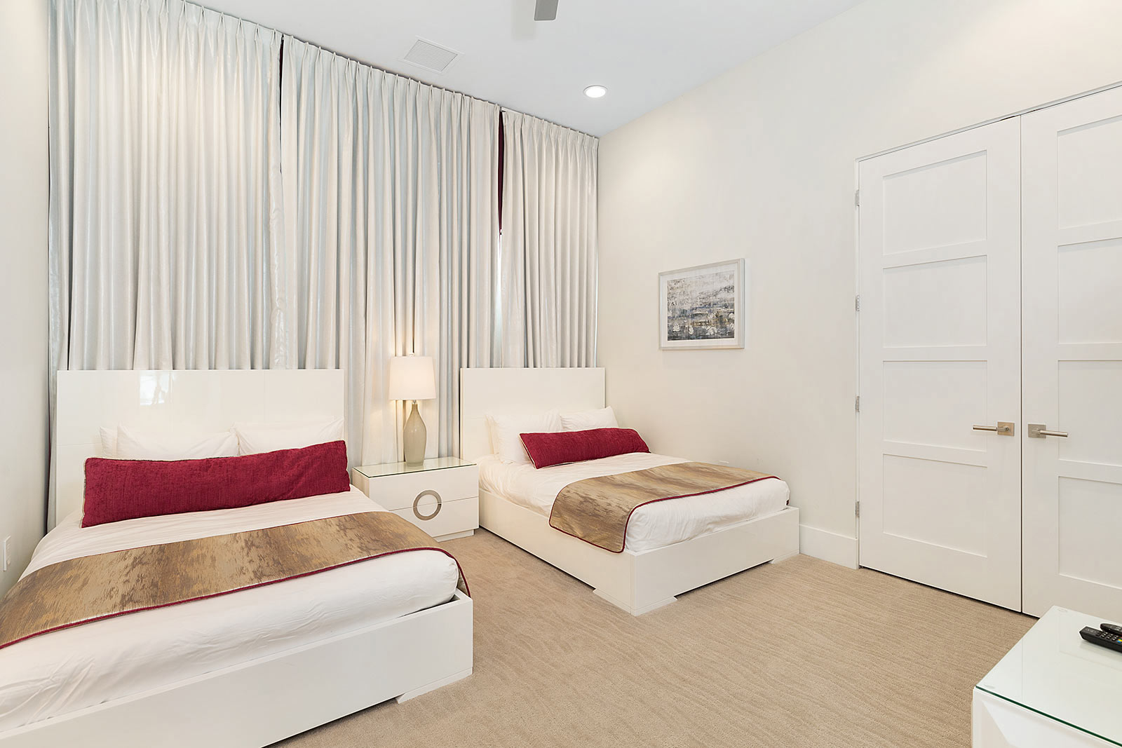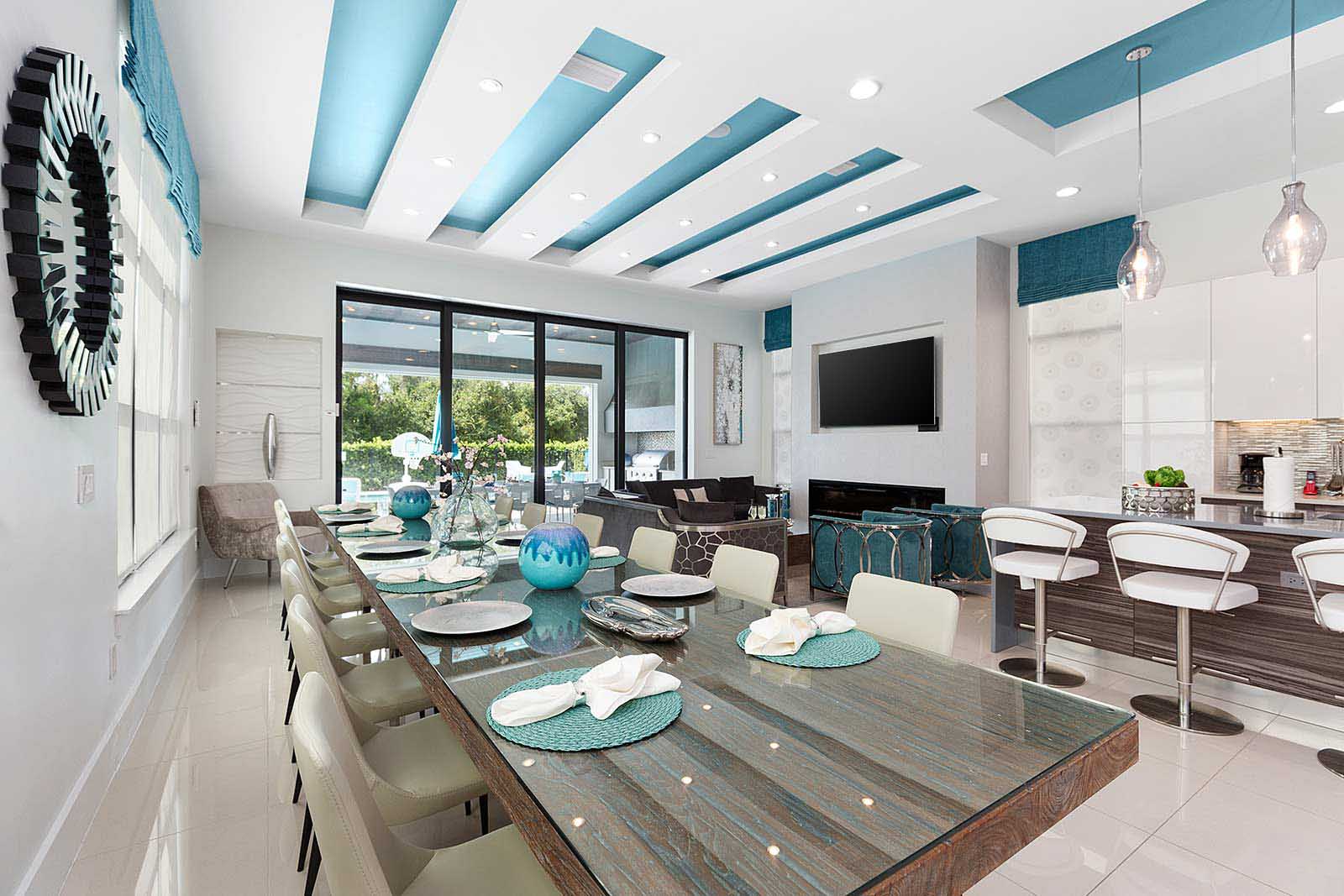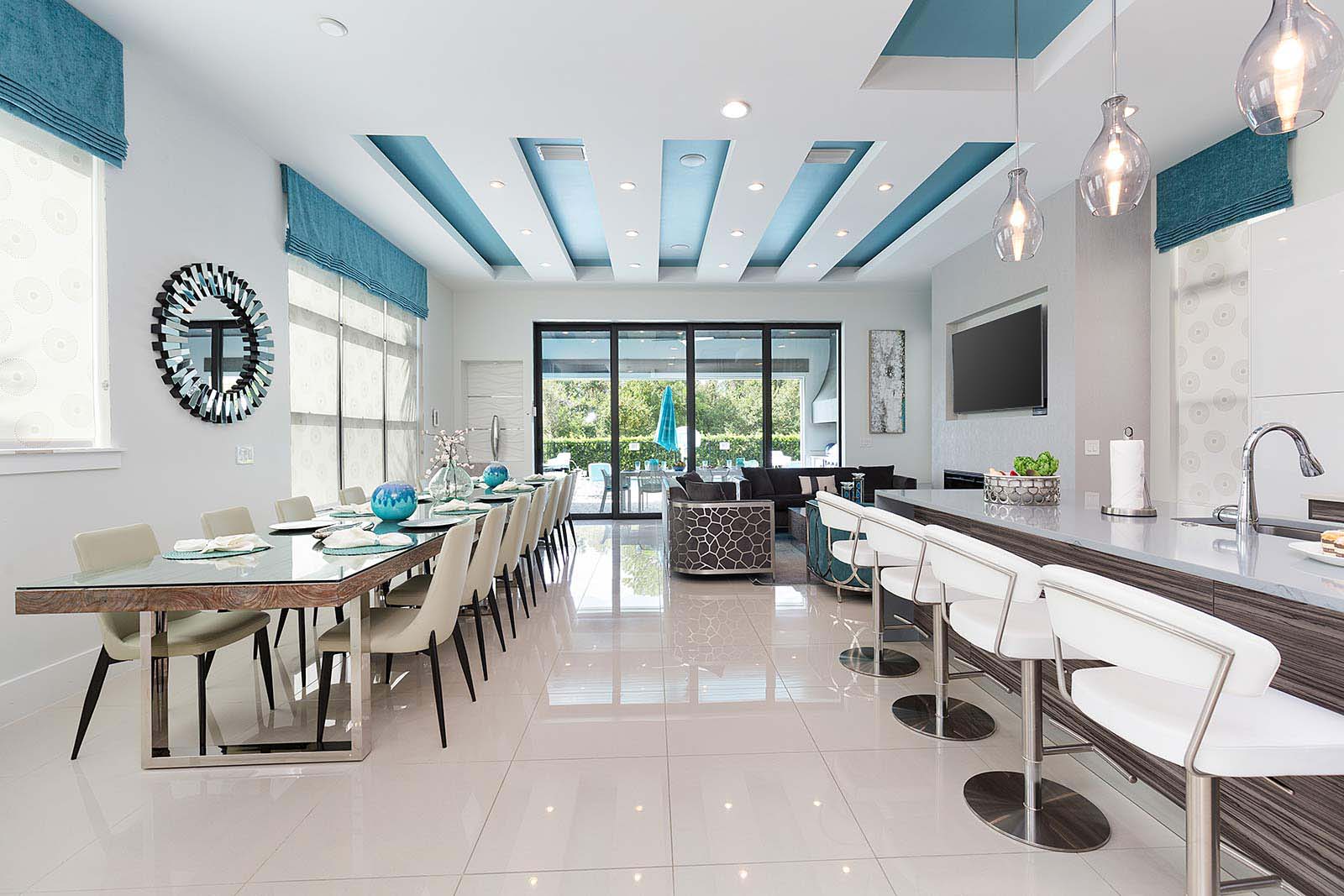 Behind the sliding floor-to-ceiling glass patio doors, enjoy your villa’s sleek, open living space—complete with two plush sofas, two accent chairs and an impressive flat-screen TV. Glossy, white floors lend a clean, polished ambiance to the entire main floor—which also plays host to a spacious kitchen and dining area.