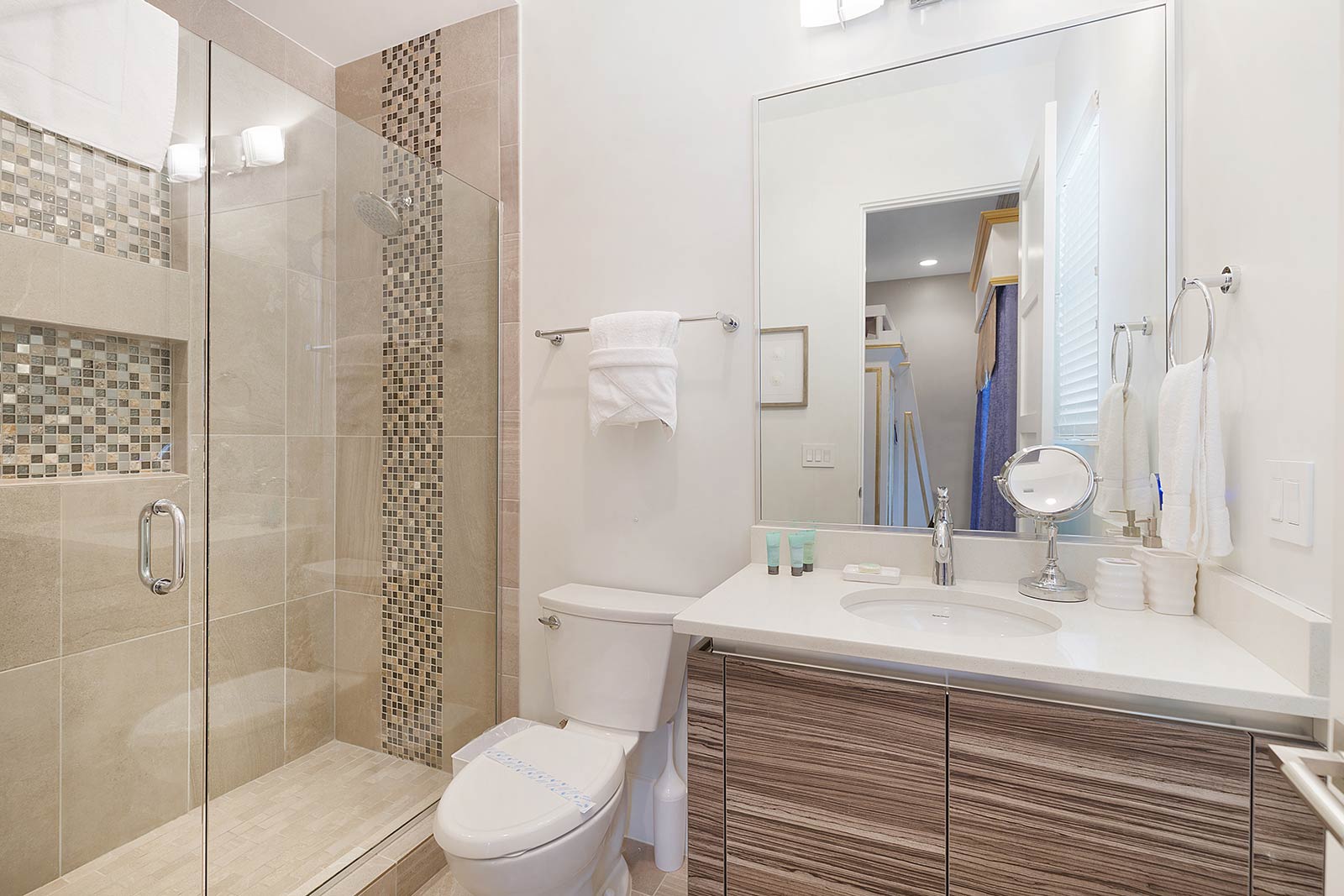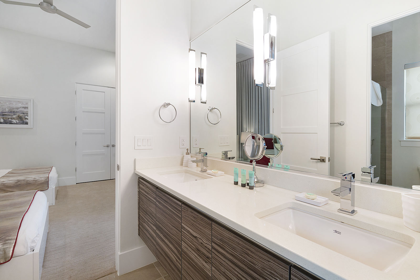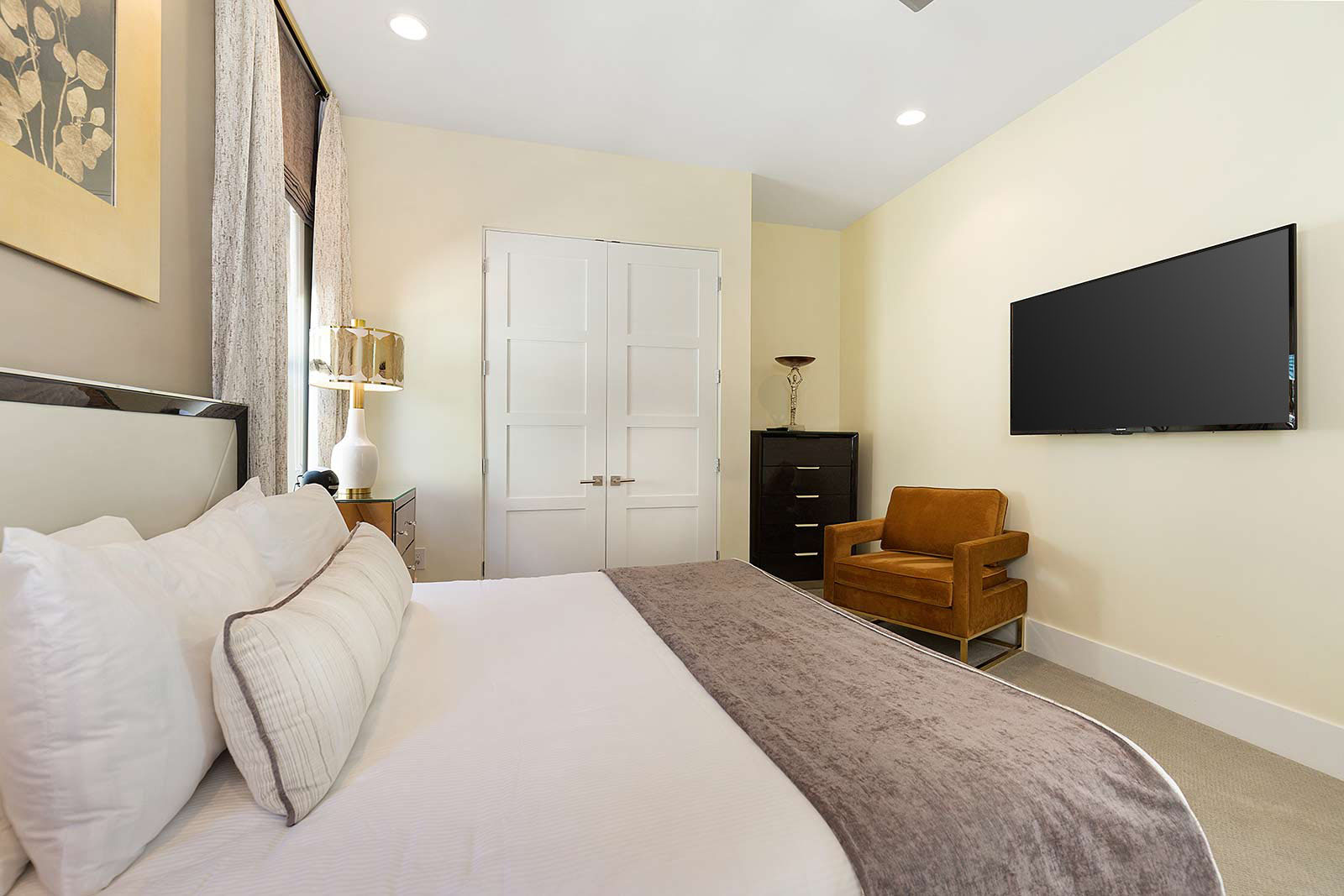 Behind the sliding floor-to-ceiling glass patio doors, enjoy your villa’s sleek, open living space—complete with two plush sofas, two accent chairs and an impressive flat-screen TV. Glossy, white floors lend a clean, polished ambiance to the entire main floor—which also plays host to a spacious kitchen and dining area.