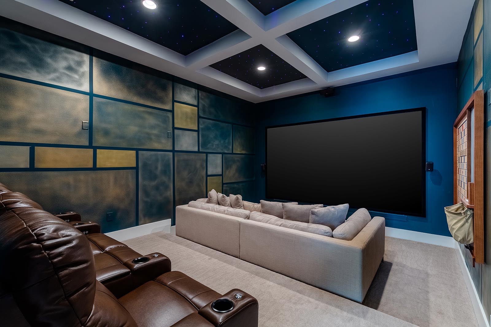 And what better way to top off a great meal than by watching a family movie—in your private home theater, of course. Get cozy in any of the four reclining theater chairs or the oversized sofa, facing a large projection screen up front, and a giant wall scrabble on the side wall. Dim the lights to reveal the unique starfield ceiling “sparkling” from above.