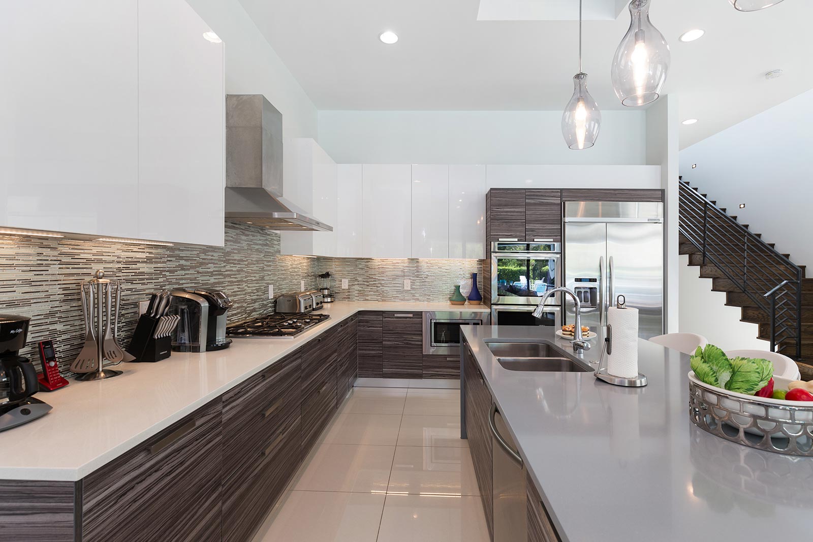 Over in the kitchen, you’ll find a stunning 4-seat breakfast bar, and all of the appliances and utensils you’ll need to prepare delicious, expertly-presented cuisine. (Think a large refrigerator/freezer, double ovens, a microwave, dishwasher, coffee maker, toaster, and cabinets stocked with cookware, dinnerware, and glassware).