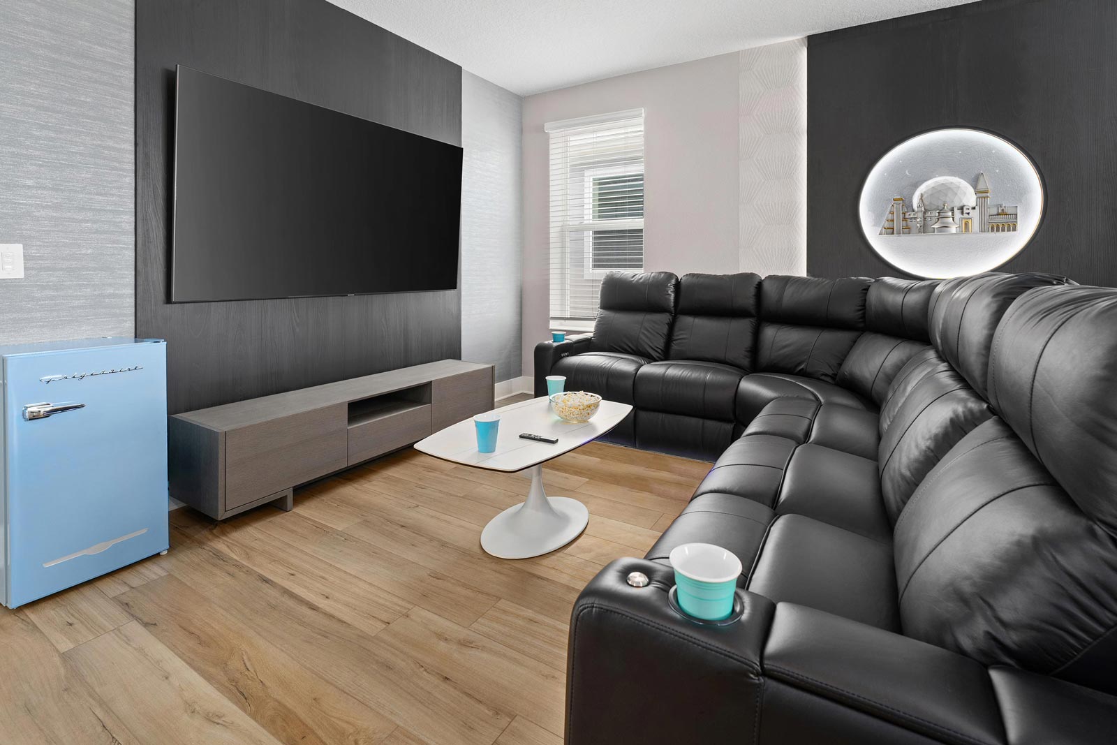 Game Loft: Step into an entertainment haven designed for gaming and relaxation! Challenge your friends to a game of poker or blackjack at the casino table, engage in epic battles on the Marvel vs. Capcom video game, or try your hand at shuffleboard or wall scrabble for some friendly competition. The jukebox is always ready to set the mood with your favorite tunes. Prefer to chill after a day at the parks? The cozy lounge area awaits, complete with a large TV, which doubles as a video game station. Play, relax, repeat!