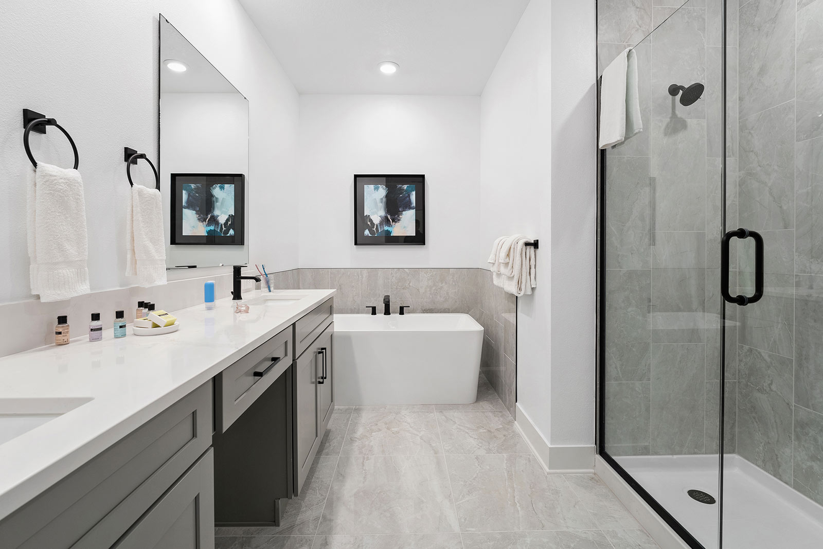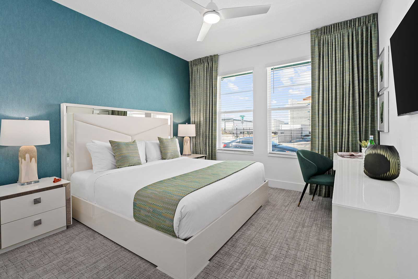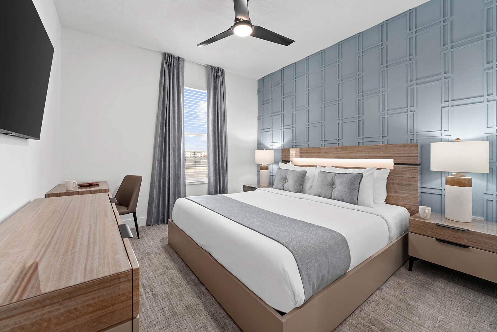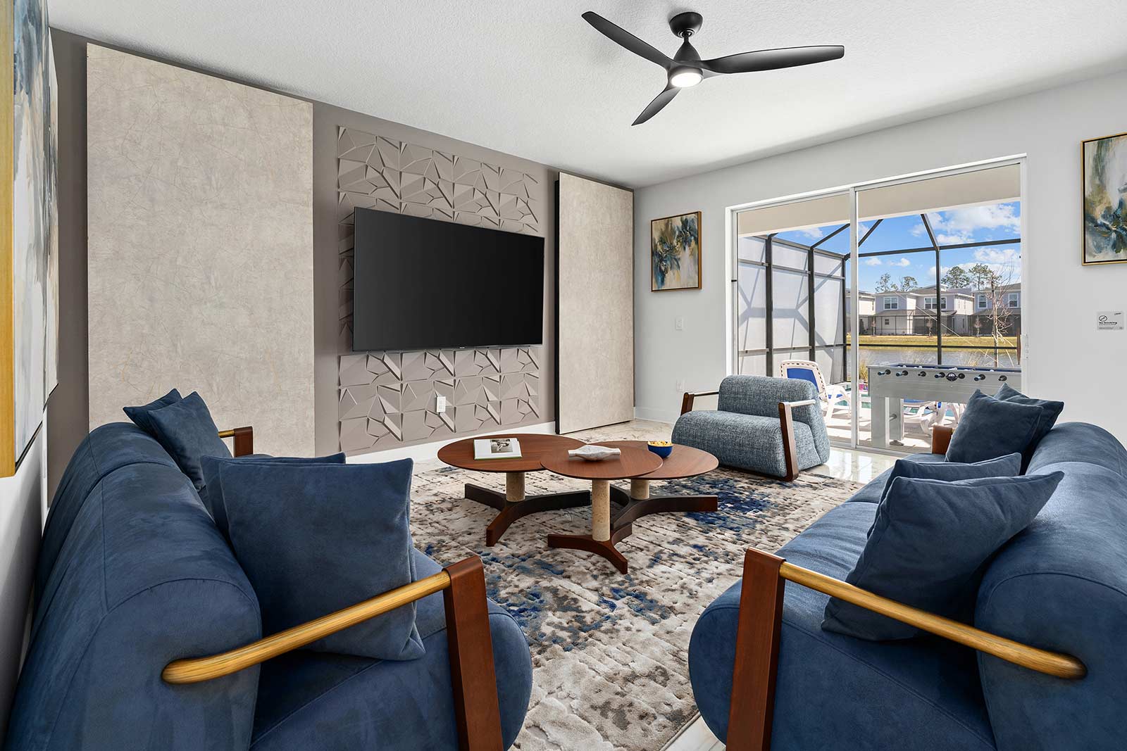 Bedrooms (Kings, Queen & Fulls): Just wait until you see the five fabulous sanctuaries awaiting your crew after action-packed days in Orlando—two on the main floor and three more upstairs. Each room features chic design touches, super comfy beds, flat-screen TVs, luxe en-suite bathrooms, and thoughtful amenities. Unique decorative wall panels lend aesthetic flair, while soothing hues (think blues, greens, and natural tones) set a calm mood for a perfect night’s rest.
