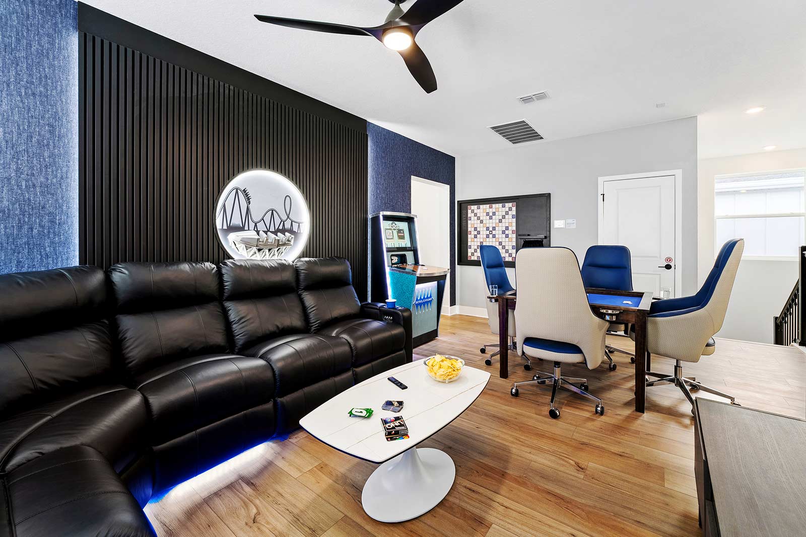 Game Loft: The second-floor loft is your go-to spot for fun and laid-back luxury. Unleash your competitive spirit at the card table, jive to the jukebox beats, and shuffle your way to victory at the shuffleboard table or wall scrabble. Plop onto the plush, oversized leather couch to shmooze, nap, or catch your favorite show on the big-screen TV that doubles as a video game stations.