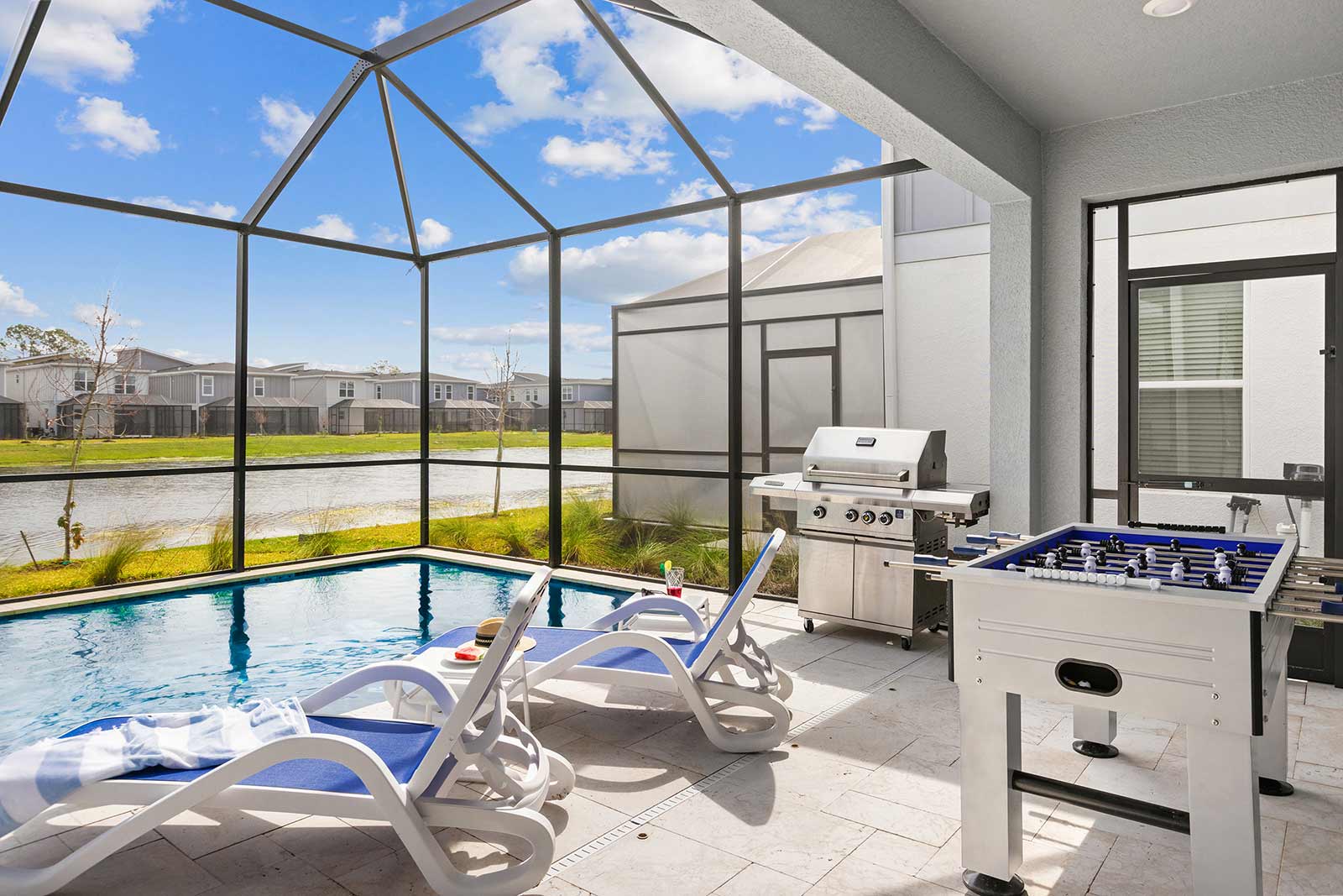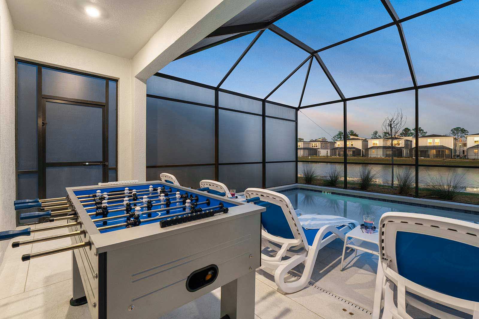 Pool & Patio: Make a splash with your gang and bask under the Florida sun in your own outdoor haven ensconced in a privacy screen. Dive into the glittering pool, lounge on chaises, or play foosball on the patio. No need to dry off when it’s time to eat—you can happily dine alfresco under the covered lanai. Your private paradise awaits!