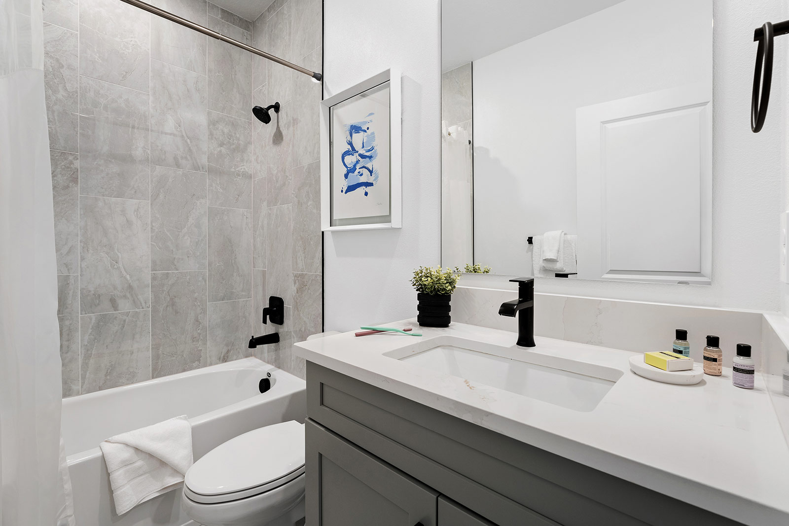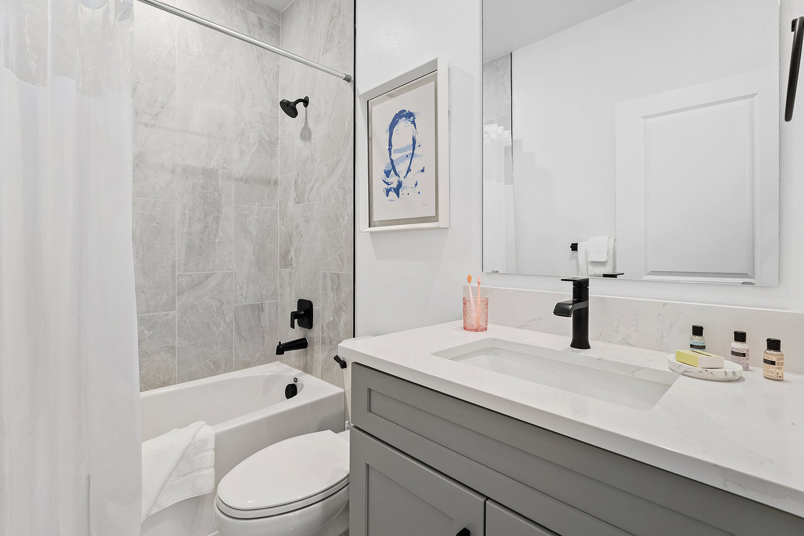 Living Room/ Dining Room: A grand, long foyer ushers you into a fabulous, open-concept living/dining room. Light and airy with clean-lined, minimalist-chic design, this space is just waiting for your gang to fill it with life! Two plush, gorgeous blue sofas and an armchair facing a 75-inch flat-screen TV are ready to seat a crowd for conversation or entertainment. When it’s time to eat, gather around the long dining table, which easily seats 10 in its modern, two-tone chairs.