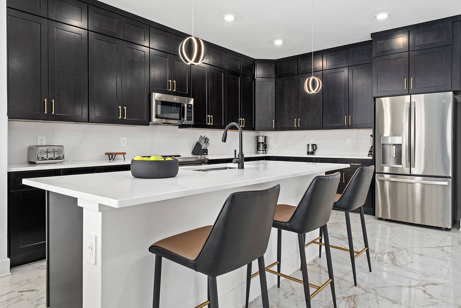 Kitchen: The party continues in the kitchen, which features generous counter space and sleek white cabinetry, filled with all the gear and gadgetry you need to serve up a feast. The chic kitchen island with stools is a perfect place to lay out some appetizers and drinks, or to linger and chat over your morning coffee before a day of adventure in Orlando.