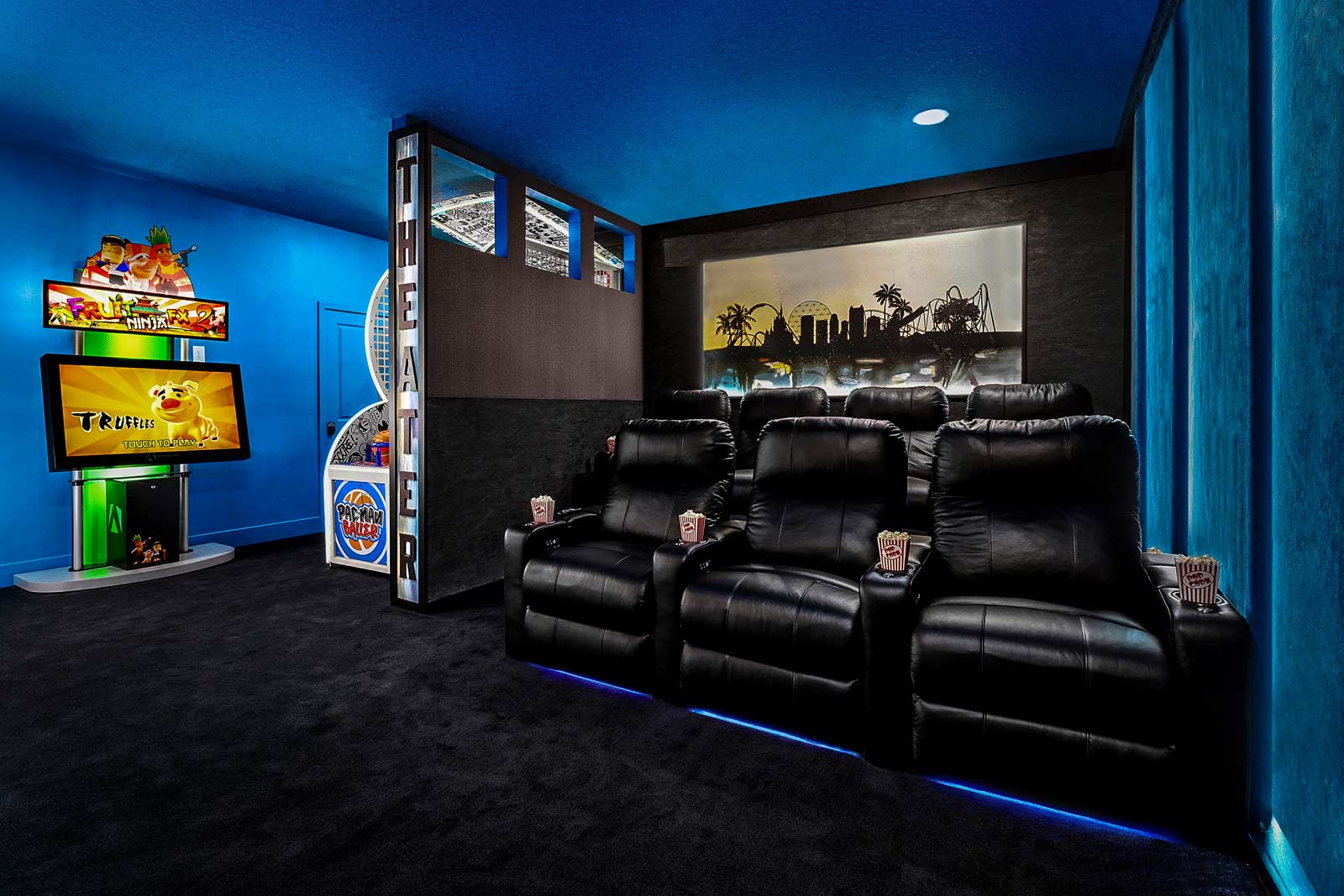 Movie Theater/ Arcade: 3-2-1 ACTION! On the screen that is…because you’ll be lounging in one of six sumptuous recliners while you catch your favorite movie on your private big screen. When the credits roll, hop on over to the Pac-Man Baller and Air Hockey arcades–a bonus amenity in this epic entertainment center.