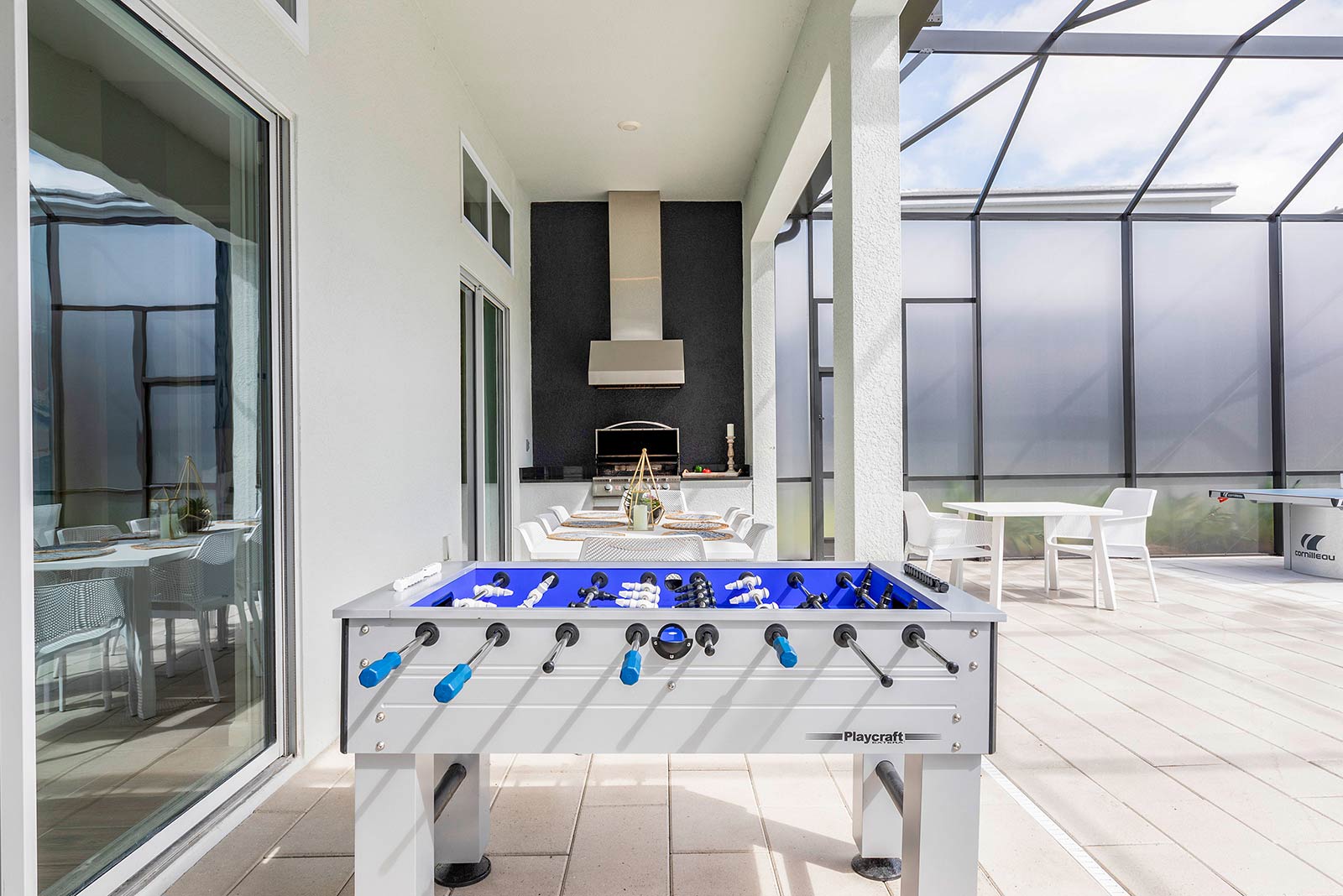 Pool & Patio: If outdoor fun is more your jam, step outside to the fabulous pool and spillover spa, enclosed with a ‘Florida glass’ screen for maximum privacy. Relax on a lounger or challenge your gang to ping-pong, foosball, or pool basketball (bonus: there’s even a mini pool slide to keep the little kids entertained). Hungry? Enjoy the best of Florida when you fire up the outdoor kitchen and dine alfresco at the spacious lanai table.