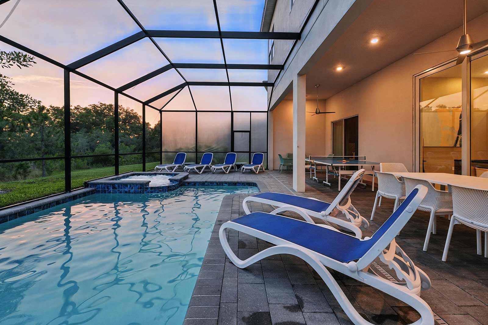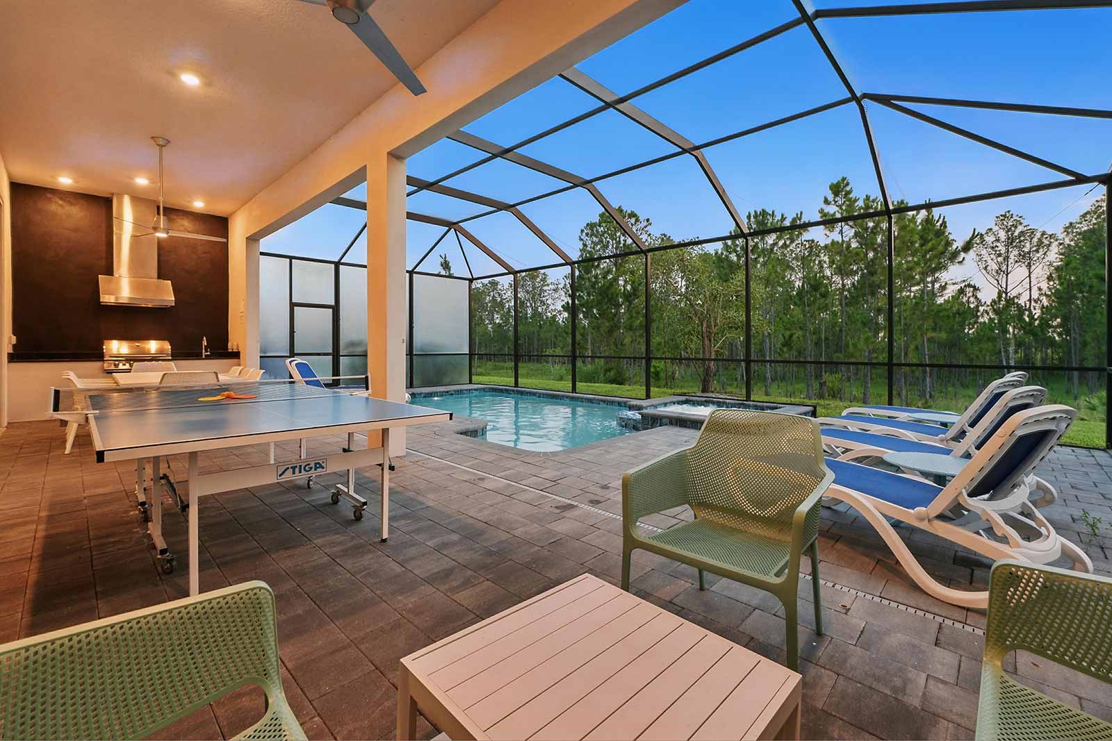 Pool & Patio: Outside, take a dip in the lovely, sparkling private pool, or soak in the bubbling spillover spa. Play pool basketball with your gang, or foosball on the patio. And be sure to take advantage of the spectacular outdoor kitchen to prep cocktails and meals that you can enjoy at the table under your shaded lanai.